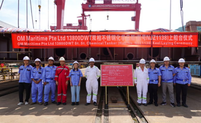 7月25日上午9時58分,新江洲船舶重工有限責任公司為新加坡船東OM Maritime海運私人有限公司建造的首艘13800DWT不銹鋼化學品船(船號NJZ1138)在公司301室外船臺舉行上船臺儀式。