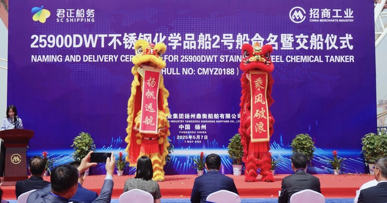 5月7日,君正船務(wù)在招商局工業(yè)集團揚州鼎衡船舶有限公司的第二艘25900載重噸不銹鋼化學(xué)品船命名暨交船儀式在揚州隆重舉行。